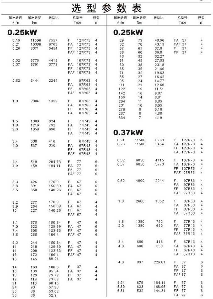 選型參數(shù)表0.25kW和0.37kW